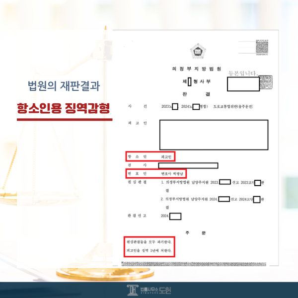 의뢰인은 다행히 부양가족이 있다는 이유로 법정구속만은 면할수 있었고 항소를 제기하여 항소심 재판을 기다리던 중 2023. 5.경 또다시 음주운전을 하다 적발되었고 이에 해당 재판에서 징역 8월의 실형을 선고받고 법정구속되었습니다.