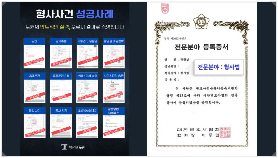 법률사무소 도헌은 대한변호사협회 등록 형사전문변호사의 전문적이고 체계적인 법률서비스를 제공하고 있으며, 이를 통해 형사사건 피의자 또는 피고인의 변호 및 피해자의 고소대리 등에서 탁월한 성과를 내고 있습니다.