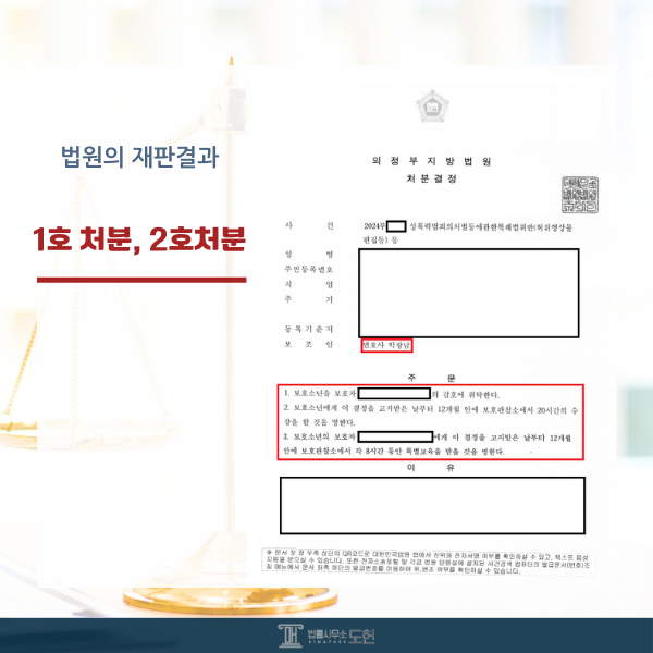 소년부 판사는 의뢰인의 개선가능성을 인정하며 비교적 경미한 처분인 '1호 : 가정 내 감호위탁, 2호 : 20시간 수강명령, 부모 대상 특별교육 포함'의 처분을 내렸습니다. 즉 의뢰인은 별도의 보호관찰이나 소년원 등 시설 수용 없이 곧바로 일상에 복귀할 수 있었던 것입니다.