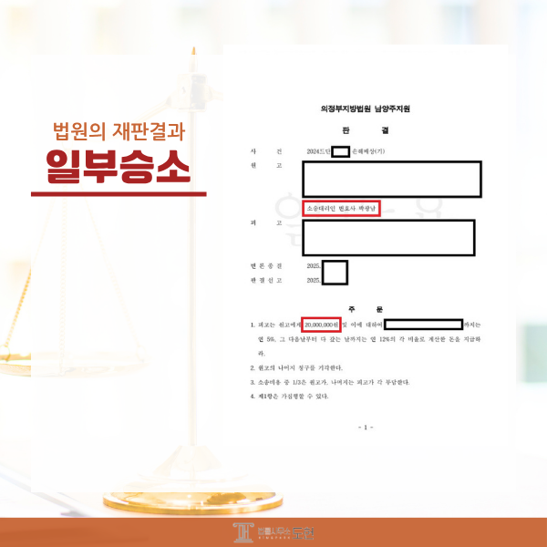 법원은 구리이혼전문변호사 법률사무소 도헌의 주장을 받아들여 피고의 부정행위로 인해 의뢰인과 B씨의 혼인관계가 파탄에 이르렀고 그로 인해 의뢰인이 상당한 정신적 고통을 겪은 점 등을 종합적으로 고려하여 피고가 의뢰인에게 2천만원의 위자료를 지급하라는 판결을 내렸습니다.