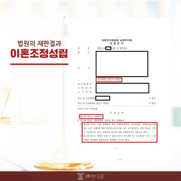 결국 소송 후반부 상대방이 불리함을 인식하고 조정에 응하면서 의뢰인은 재산분할금 전액 면제, 즉 현재 각자 명의의 재산을 그대로 유지하는 조정으로 사건을 마무리할 수 있었습니다.