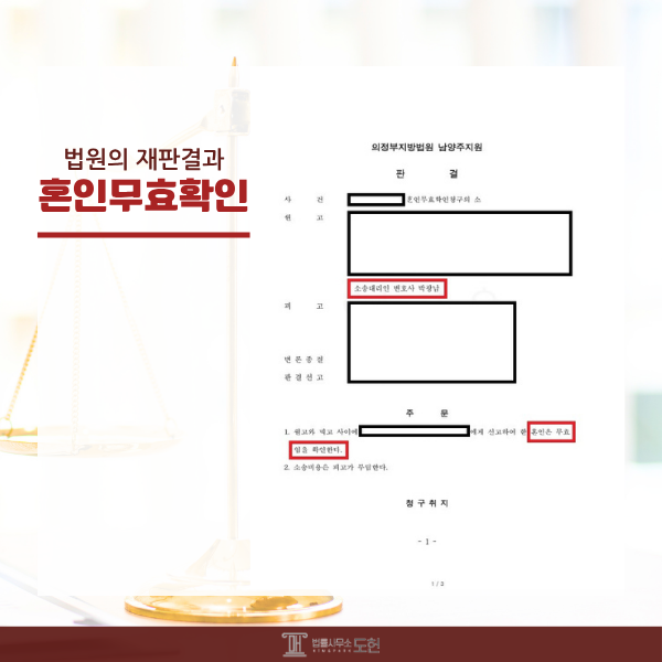 남양주이혼변호사 법률사무소 도헌의 변호사들은 조목조목 법리로 재판부를 설득하며 의뢰인이 혼인신고에 관여하지 않았음을 명확히 입증했습니다. 결국 재판부는 민법 제815조 제1호에 근거하여 "당사자 간 혼인의 합의가 없었으므로 의뢰인과 상대방의 혼인은 무효임을 확인한다."는 판결을 내렸습니다.