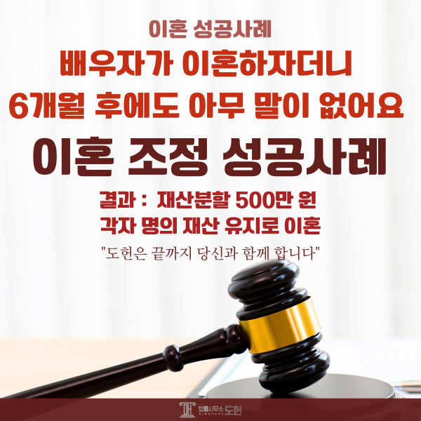 결국 아내는 조정기일에서 더는 반대하지 못하고 남양주이혼변호사 법률사무소 도헌이 준비한 조건 그대로 이혼조정이 성립되었습니다.