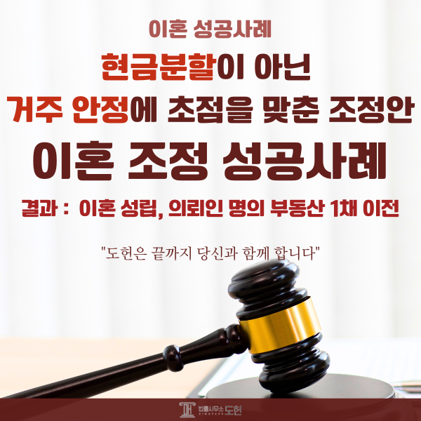 아내는 처음에 현금 분할을 원했지만 남양주이혼전문변호사 법률사무소 도헌의 변호사님들은 "아내에게 필요한 것은 현금이 아니라 주거 안정"이라는 점에 집중해 전략을 수립했습니다.