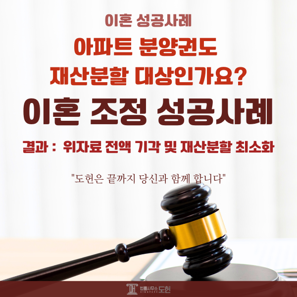 그 결과 재판부는 조정 절차로 회부했고 남양주이혼변호사 법률사무소 도헌 변호사님들은 조정 자리에서 분양권이 분할 대상이 아님을 강하게 주장하였고 설령 분할 대상이라 해도 아내의 기여도는 극히 낮다는 점을 설득력 있게 펼쳤습니다.