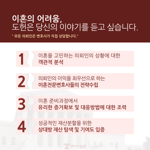 이건 억울했습니다. 그래서 저는 바로 남양주이혼변호사 법률사무소 도헌을 찾았습니다. 변호사님들은 제 이야기를 차분히 들으며 "사실관계와 기여도를 정확히 증명할 수 있다면 결과는 달라집니다."라고 말씀하셨습니다.