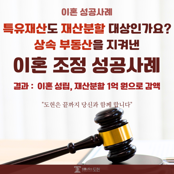 핵심 쟁점은 아내가 의뢰인에게 요구한 "상속 부동산"의 재산분할 포함 여부였습니다. 하남이혼변호사 법률사무소 도헌은 다음을 강하게 주장했습니다. ① 해당 부동산은 의뢰인이 2년 전 아버지에게서 단독 상속받은 특유재산, ②아내의 기여는 미미하여 특유재산 유지·증가에 관여한 사실이 거의 없음, ③의뢰인은 혼자 경제활동을 하며 가족 생계를 전적으로 책임져왔다는 점들을 객관적 자료로 입증하고 변론 과정에서 강하게 어필했습니다.