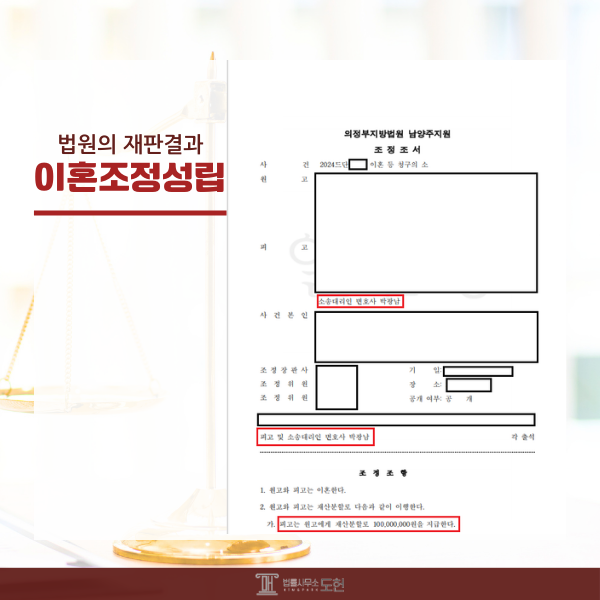 그 결과 재판부는 이혼소송을 조정절차로 회부했고 소송 과정에서 이미 형성된 의뢰인에게 유리한 분위기를 바탕으로 조정에서 상대방을 설득하여 최종적으로 위자료 제외, 재산분할금 1억 원으로 조정이 성립되었습니다.