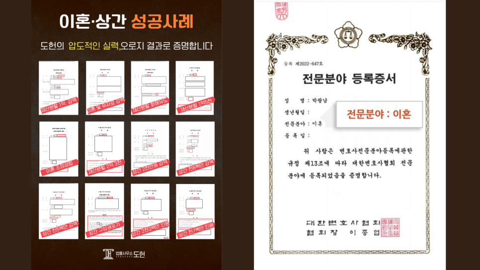 법률사무소 도헌은 대한변호사협회 등록 이혼전문변호사 및 민사전문변호사의 전문적이고 체계적인 법률서비스를 제공하고 있으며, 이를 통해 상간소송, 이혼, 위자료, 재산분할, 양육비 등에서 탁월한 성과를 내고 있습니다.